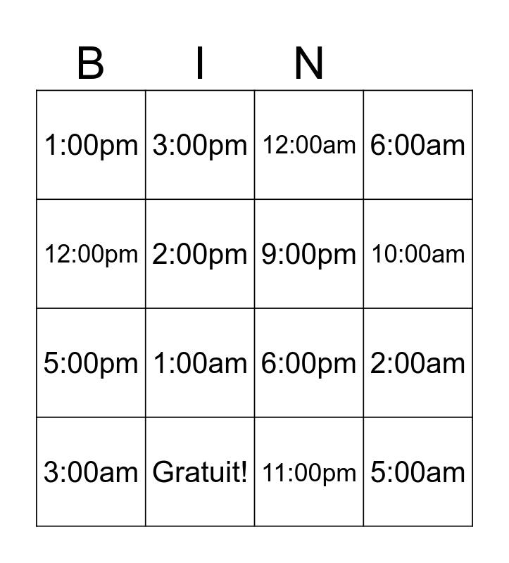 This bingo card has 25 words: 8:00am, 9:00am, 10:00am, 11:00am, 12:00pm, 1:00pm, 2:00pm, 3:00pm, Gratuit!, 4:00pm, 5:00pm, 6:00pm, 7:00pm, 8:00pm, 9:00pm, 10:00pm, 11:00pm, 12:00am, 1:00am, 2:00am, 3:00am, 4:00am, 5:00am, 6:00am and 7:00am.