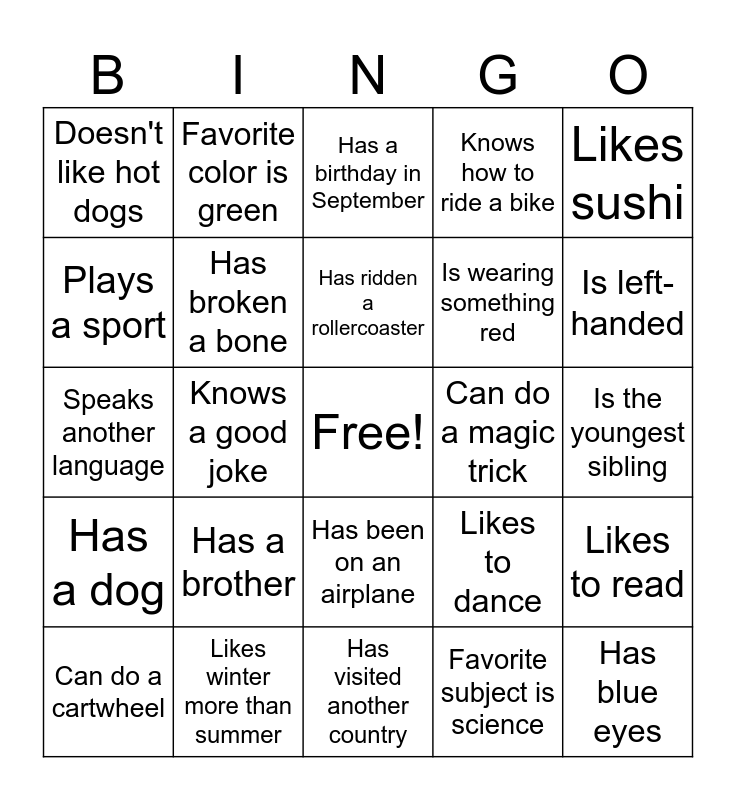 This bingo card has a free space and 24 words: Has a brother, Likes winter more than summer, Has ridden a rollercoaster, Can do a cartwheel, Likes sushi, Doesn't like hot dogs, Plays a sport, Favorite color is green, Can do a magic trick, Has been on an airplane, Is wearing something red, Speaks another language, Likes to dance, Likes to read, Has broken a bone, Favorite subject is science, Is the youngest sibling, Has a birthday in September, Is left-handed, Knows a good joke, Has blue eyes, Has a dog, Knows how to ride a bike and Has visited another country.