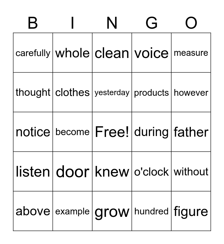 This bingo card has a free space and 29 words: above, among, become, between, carefully, clean, clothes, door, during, example, father, figure, grow, hundred, however, important, knew, listen, measure, notice, o'clock, pattern, products, thought, voice, whole, without, yesterday and though.