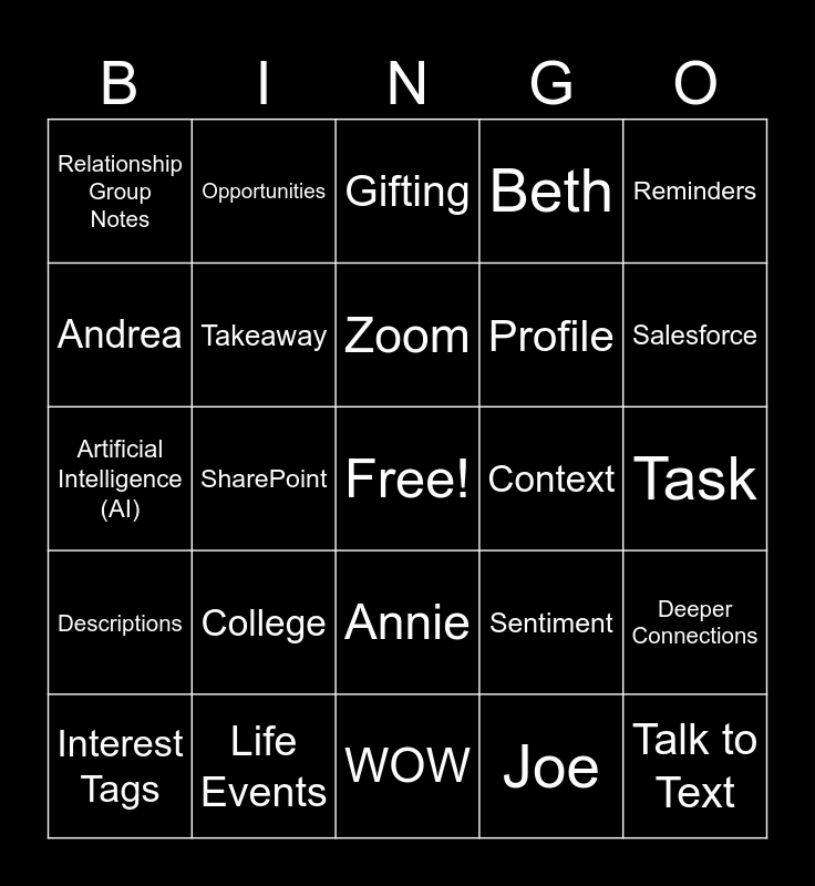 This bingo card has a free space and 54 words: Interaction Notes, Descriptions, Ecosystem, Tools, Annie, Barry, Beth, Interest Tags, Andrea, Leverage, Relationship Group Notes, Network Connections, Life Events, Interest Tags, Strategic Assets, WOW, Talk to Text, Profile, Appointment, Task, Sentiment, Outcome, Context, Reminders, Catered Services, Opportunities, Hobbies, Sports, Drink Preferences, Joe, Linda, Vacation, Home, Subject, Gifting, Strategies, Artificial Intelligence (AI), Deeper Connections, Tale, Takeaway, Stocks, ACH, BAM, Estates, College, Branch A, Branch B, Asset Gathering, Zoom, SharePoint, Salesforce, Traditional IRA, Roth IRA and Supplies.