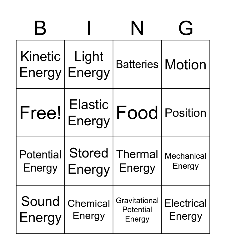 This bingo card has 16 words: Chemical Energy, Mechanical Energy, Batteries, Kinetic Energy, Potential Energy, Light Energy, Thermal Energy, Gravitational Potential Energy, Free!, Elastic Energy, Sound Energy, Motion, Stored Energy, Position, Food and Electrical Energy.