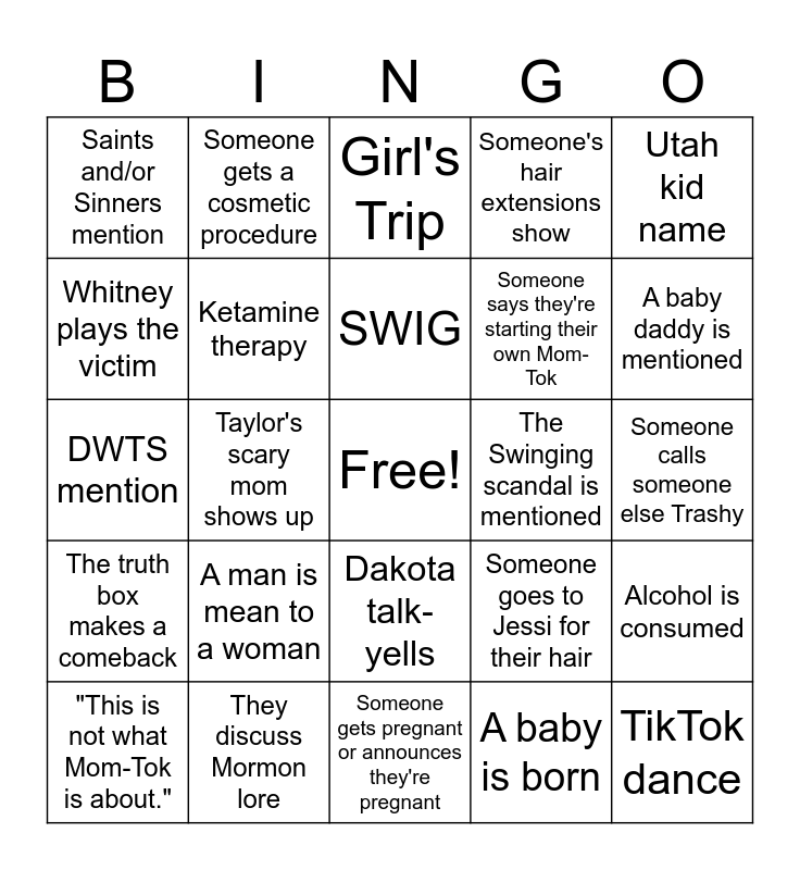 This bingo card has a free space and 24 words: A man is mean to a woman, They discuss Mormon lore, SWIG, "This is not what Mom-Tok is about.", Utah kid name, Saints and/or Sinners mention, Whitney plays the victim, Someone gets a cosmetic procedure, The Swinging scandal is mentioned, Dakota talk-yells, Someone says they're starting their own Mom-Tok, DWTS mention, Someone goes to Jessi for their hair, Alcohol is consumed, Ketamine therapy, A baby is born, Someone calls someone else Trashy, Girl's Trip, A baby daddy is mentioned, Taylor's scary mom shows up, TikTok dance, The truth box makes a comeback, Someone's hair extensions show and Someone gets pregnant or announces they're pregnant.