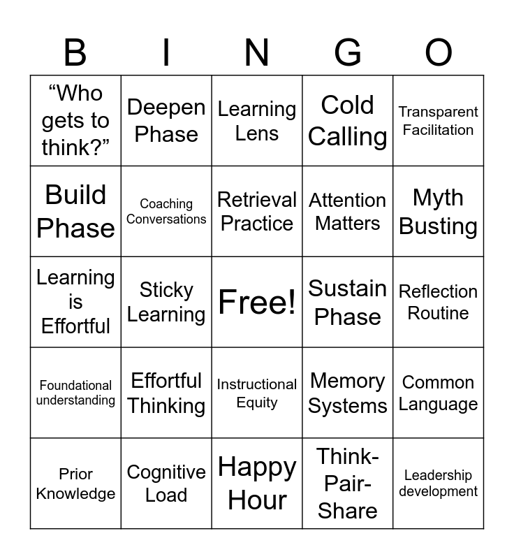 This bingo card has a free space and 24 words: Effortful Thinking, Cognitive Load, Retrieval Practice, Prior Knowledge, Transparent Facilitation, “Who gets to think?”, Build Phase, Deepen Phase, Sustain Phase, Instructional Equity, Attention Matters, Learning is Effortful, Memory Systems, Common Language, Coaching Conversations, Think-Pair-Share, Reflection Routine, Learning Lens, Myth Busting, Sticky Learning, Leadership development, Foundational understanding, Cold Calling and Happy Hour.