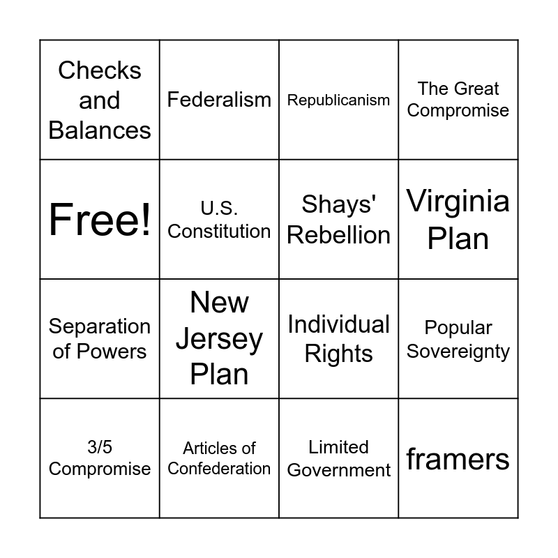 This bingo card has 16 words: Articles of Confederation, Popular Sovereignty, Republicanism, Checks and Balances, Separation of Powers, Federalism, Individual Rights, Limited Government, Free!, U.S. Constitution, 3/5 Compromise, The Great Compromise, New Jersey Plan, Virginia Plan, Shays' Rebellion and framers.