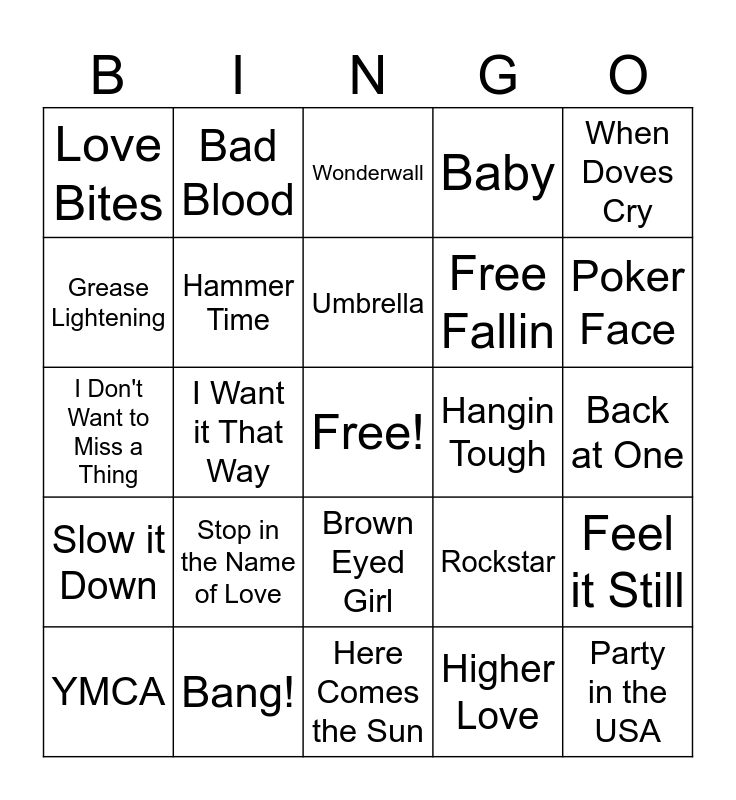 This bingo card has a free space and 24 words: Stop in the Name of Love, Bang!, Umbrella, YMCA, When Doves Cry, Love Bites, Grease Lightening, Bad Blood, Hangin Tough, Brown Eyed Girl, Free Fallin, I Don't Want to Miss a Thing, Rockstar, Feel it Still, Hammer Time, Higher Love, Back at One, Wonderwall, Poker Face, I Want it That Way, Party in the USA, Slow it Down, Baby and Here Comes the Sun.