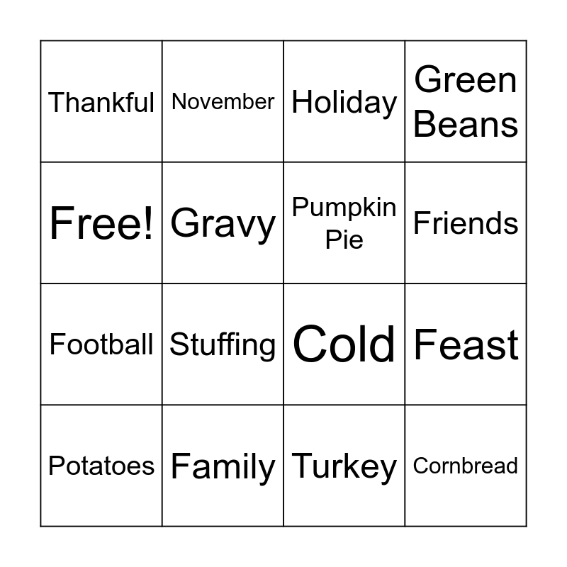 This bingo card has 16 words: Family, Feast, Holiday, Thankful, Football, November, Cold, Turkey, Free!, Gravy, Potatoes, Green Beans, Stuffing, Friends, Pumpkin Pie and Cornbread.
