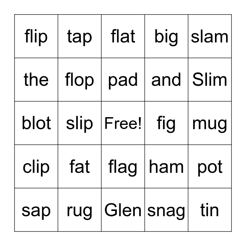 This bingo card has a free space and 29 words: sap, slap, slip, slop, flip, flat, flop, fat, fig, rug, mug, tin, Glen, snag, Slim, club, flag, clip, slam, blot, ham, in, and, the, big, tap, pot, pad and dab.