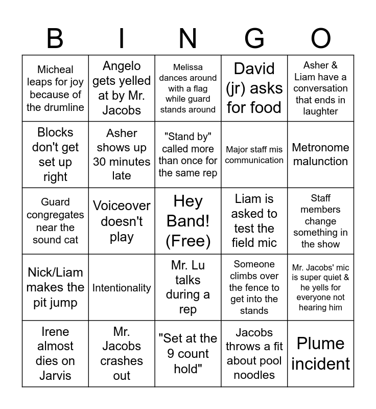 This bingo card has a free space and 24 words: Intentionality, Mr. Jacobs crashes out, "Stand by" called more than once for the same rep, Irene almost dies on Jarvis, Asher & Liam have a conversation that ends in laughter, Micheal leaps for joy because of the drumline, Blocks don't get set up right, Angelo gets yelled at by Mr. Jacobs, Liam is asked to test the field mic, Mr. Lu talks during a rep, Major staff mis communication, Guard congregates near the sound cat, Someone climbs over the fence to get into the stands, Mr. Jacobs' mic is super quiet & he yells for everyone not hearing him, Asher shows up 30 minutes late, Jacobs throws a fit about pool noodles, Staff members change something in the show, Melissa dances around with a flag while guard stands around, Metronome malunction, Voiceover doesn't play, Plume incident, Nick/Liam makes the pit jump, David (jr) asks for food and "Set at the 9 count hold".