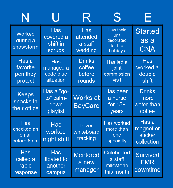 This bingo card has a free space and 24 words: Has worked night shift, Has floated to another campus, Drinks coffee before rounds, Has called a rapid response, Started as a CNA, Worked during a snowstorm, Has a favorite pen they protect, Has covered a shift in scrubs, Has been a nurse for 15+ years, Loves whiteboard tracking, Has led a joint commission visit, Keeps snacks in their office, Has worked more than one specialty, Has a magnet or sticker collection, Has managed a code blue situation, Celebrated a staff milestone this month, Drinks more water than coffee, Has attended a staff wedding, Has worked a double shift, Has a "go-to" calm-down playlist, Survived EMR downtime, Has checked an email before 6 am, Has their unit decorated for the holidays and Mentored a new manager.