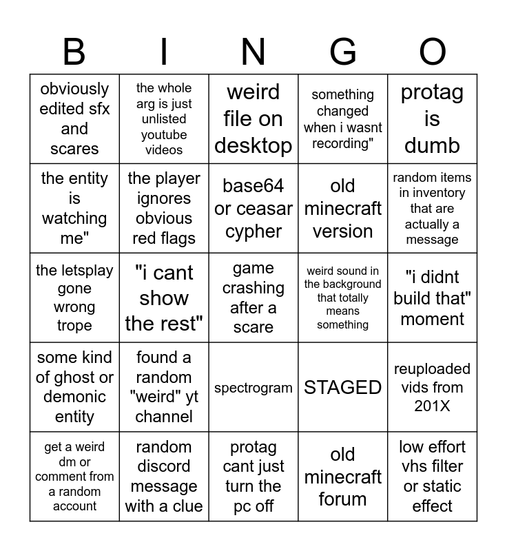 This bingo card has 25 words: found a random "weird" yt channel, protag cant just turn the pc off, base64 or ceasar cypher, get a weird dm or comment from a random account, protag is dumb, obviously edited sfx and scares, the entity is watching me", the whole arg is just unlisted youtube videos, weird sound in the background that totally means something, spectrogram, old minecraft version, the letsplay gone wrong trope, STAGED, reuploaded vids from 201X, the player ignores obvious red flags, low effort vhs filter or static effect, "i didnt build that" moment, weird file on desktop, random items in inventory that are actually a message, "i cant show the rest", game crashing after a scare, random discord message with a clue, some kind of ghost or demonic entity, something changed when i wasnt recording" and old minecraft forum.