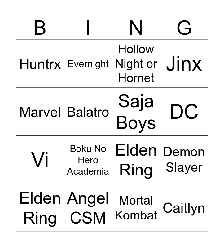This bingo card has 22 words: Angel CSM, Denji, Evernight, Rem, Balatro, Saja Boys, Huntrx, Hollow Night or Hornet, Elden Ring, Caitlyn, Vi, Jinx, Furina, Raiden Genshin, Mortal Kombat, Ahri, Demon Slayer, Elden Ring, Boku No Hero Academia, Marvel, DC and Overwatch.