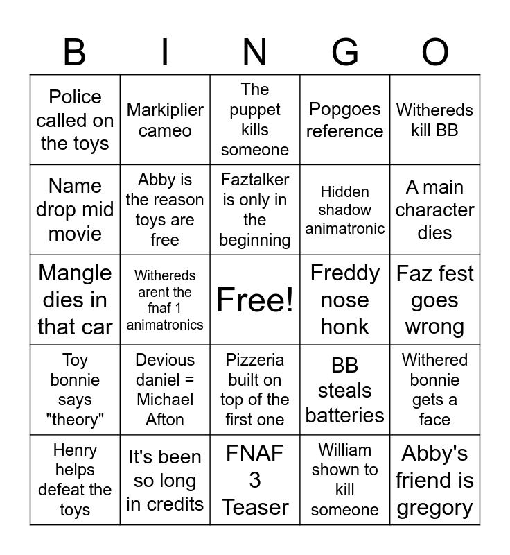 This bingo card has a free space and 24 words: Devious daniel = Michael Afton, It's been so long in credits, Faztalker is only in the beginning, Henry helps defeat the toys, Withereds kill BB, Police called on the toys, Name drop mid movie, Markiplier cameo, Freddy nose honk, Pizzeria built on top of the first one, Hidden shadow animatronic, Mangle dies in that car, BB steals batteries, Withered bonnie gets a face, Abby is the reason toys are free, William shown to kill someone, Faz fest goes wrong, The puppet kills someone, A main character dies, Withereds arent the fnaf 1 animatronics, Abby's friend is gregory, Toy bonnie says "theory", Popgoes reference and FNAF 3 Teaser.