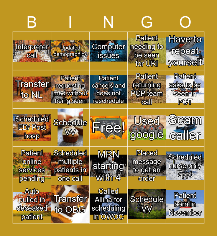 This bingo card has 24 images, a free space and 24 words: Auto pulled in deceased patient, Scheduled multiple patients in one call, Patient cancels and does not reschedule, Schedule VV, Have to repeat yourself, Interpreter call, Updated demographics, Computer issues, Used google, Scam caller, Scheduled ED/ Post hosp, Patient requesting med without being seen, Placed message to get an order, Scheduled nurse only appt, Transfer to NL, Transfer to OBG, Called Allina for scheduling in OWOC, Patient needing to be seen for URI, Patient asks to be seen in PCT, Patient online services pending, Schedule VV, MRN starting with 4, Patient returning PCP team call and Patient born in November.
