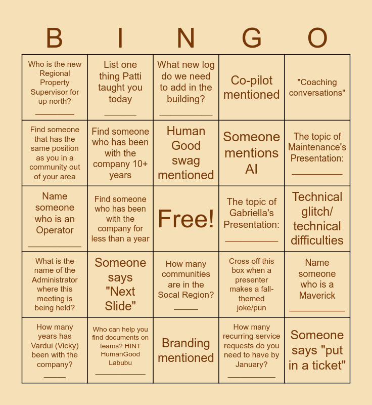 This bingo card has a free space and 39 words: "Work orders", Onesite mentioned, My PI Type is: ________, Find someone who has been with the company 10+ years, How many years has Vardui (Vicky) been with the company? _____, How many communities are in the Socal Region? _____, Human Good swag mentioned, Who is the new Regional Director up North? _______, "Coaching conversations", What is the name of the Administrator where this meeting is being held?, Find someone who has been with the company for less than a year, Co-pilot mentioned, Someone says "put in a ticket", Technical glitch/ technical difficulties, The topic of Gabriella's Presentation: __________, Someone says "Next Slide", The topic of Loren and Angela's Presentation: _________, Who is the new Regional Property Supervisor for up north? _________, Cross off when someone says "Happy Fall Y'all", Cross off this box when a presenter makes a fall-themed joke/pun, Find someone that has the same position as you in a community out of your area, Branding mentioned, Someone mentions AI, The topic of Maintenance's Presentation: __________, What type of earrings is the admin from RWC wearing? ___________, Find somebody wearing boots _________, How many team members work at Casa De La Paloma? __________, What types of meat did the taquero bring? __________, Who donated the taquero? _________, List one thing Patti taught you today ______, What photo is in the restroom? __________, Where do you input service requests? _________, What new log do we need to add in the building? __________, Who can help you find documents on teams? HINT HumanGood Labubu _____________, How many recurring service requests do you need to have by January? ___________, Name someone who is a Promoter __________, Name someone who is a Maverick ___________, Name someone who is an Operator __________ and Name someone who is a collaborator _______.