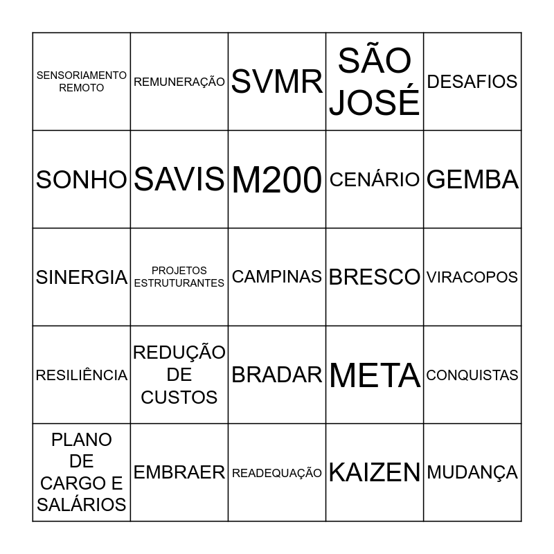 This bingo card has 41 words: INTEGRAÇÃO, SINERGIA, SISFRON, SAVIS, EMBRAER, BRADAR, M200, C3I, DESAFIOS, RESILIÊNCIA, PROJETOS ESTRUTURANTES, SÃO JOSÉ, CAMPINAS, VIRACOPOS, BRESCO, REDUÇÃO DE CUSTOS, ECONOMIA, SENSORIAMENTO REMOTO, MAGE, SVMR, CONQUISTAS, MUDANÇA, READEQUAÇÃO, CENÁRIO, OPORTUNIDADE, BEBEMORAR, KAIZEN, PROEE, GEMBA, REINVENTAR, CAPITAL HUMANO, REMUNERAÇÃO, PLANO DE CARGO E SALÁRIOS, FUTURO, META, SONHO, 2017, EQUALIZAR, BENEFÍCIOS, VALE REFEIÇÃO and CELEBRAR.