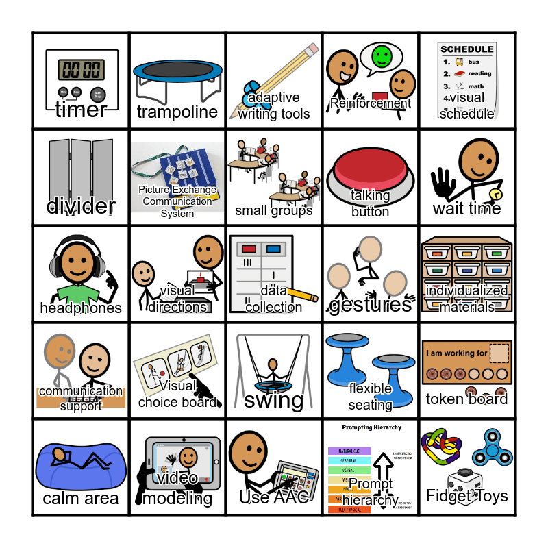 This bingo card has 25 images and 25 words: Visual choice board, Use AAC, small groups, calm area, visual schedule, timer, divider, trampoline, gestures, swing, talking button, headphones, flexible seating, token board, Picture Exchange Communication System, Fidget Toys, individualized materials, adaptive writing tools, wait time, visual directions, data collection, video modeling, communication support, Reinforcement and Prompt hierarchy.