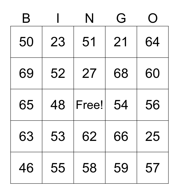 This bingo card has a free space and 29 words: 46, 47, 48, 49, 50, 51, 52, 53, 54, 55, 56, 57, 58, 59, 60, 61, 62, 63, 64, 65, 66, 67, 68, 69, 21, 23, 25, 27 and 29.
