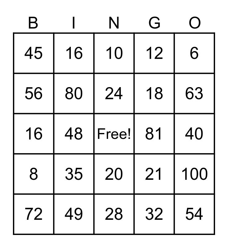 This bingo card has a free space and 24 words: 35, 49, 24, 72, 6, 45, 56, 16, 81, 20, 18, 16, 21, 100, 80, 32, 40, 10, 63, 48, 54, 8, 12 and 28.