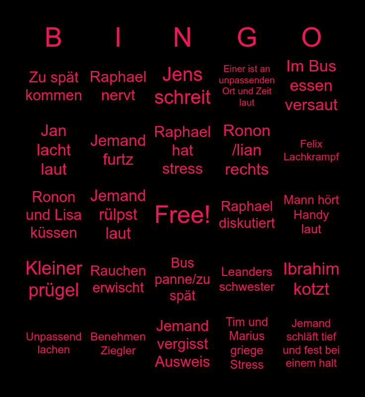 This bingo card has a free space and 24 words: Rauchen erwischt, Benehmen Ziegler, Raphael hat stress, Unpassend lachen, Im Bus essen versaut, Zu spät kommen, Jan lacht laut, Raphael nervt, Raphael diskutiert, Bus panne/zu spät, Ronon /lian rechts, Ronon und Lisa küssen, Leanders schwester, Ibrahim kotzt, Jemand furtz, Tim und Marius griege Stress, Mann hört Handy laut, Jens schreit, Felix Lachkrampf, Jemand rülpst laut, Jemand schläft tief und fest bei einem halt, Kleiner prügel, Einer ist an unpassenden Ort und Zeit laut and Jemand vergisst Ausweis.