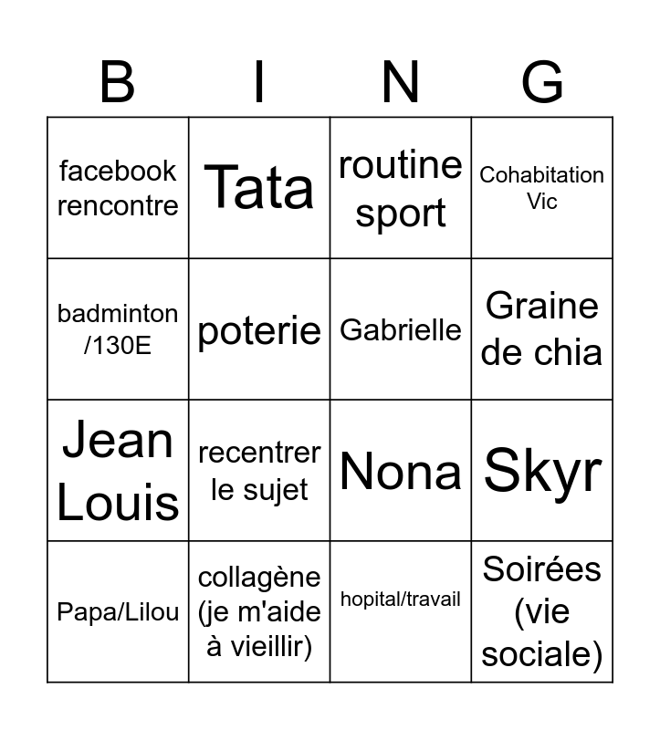 This bingo card has 16 words: collagène (je m'aide à vieillir), Skyr, routine sport, facebook rencontre, Jean Louis, Tata, Nona, hopital/travail, badminton /130E, poterie, Papa/Lilou, Cohabitation Vic, recentrer le sujet, Graine de chia, Gabrielle and Soirées (vie sociale).