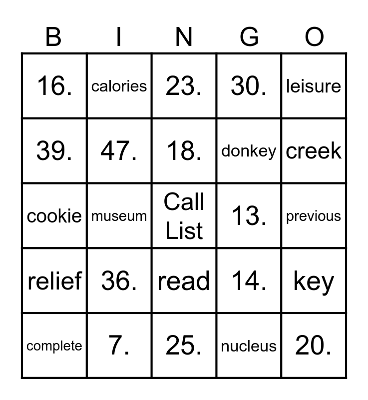 This bingo card has 100 words: Free!, ., previous, 2., either, 3., memory, 4., stream, 5., meat, 6., need, 7., honey, 8., donkey, 9., puppy, 10., memory, 11., queen, 12., teacher, 13., leisure, 14., receive, 15., museum, 16., extreme, 17., nucleus, 18., key, 19., very, 20., Pete, 21., cookie, 22., creek, 23., belief, 24., jersey, 25., people, 26., create, 27., breeze, 28., money, 29., dream, 30., crazy, 31., thirty, 32., ceiling, 33., tea, 34., protein, 35., Chinese, 36., rocky, 37., cereal, 38., complete, 39., country, 40., leader, Call List, 41., read, 42., calories, 43., knee, 44., relief, 45., Tony, 46., complete, 47., please, 48., meow, 49. and beat.