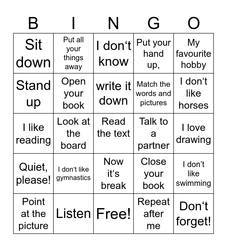 This bingo card has 25 words: Quiet, please!, Listen, Read the text, Repeat after me, My favourite hobby, Sit down, Put all your things away, I don‘t know, Talk to a partner, I don’t like swimming, Stand up, Open your book, Free!, Close your book, I don‘t like horses, Point at the picture, Look at the board, write it down, Match the words and pictures, I love drawing, I like reading, I don‘t like gymnastics, Now it‘s break, Put your hand up, and Don‘t forget!.