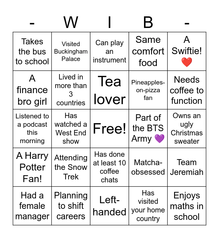 This bingo card has a free space and 39 words: Multi-lingual queen (more than 3 languages), Dog lover, Team Conrad, Lived in more than 3 countries, Had a female manager, Has done at least 10 coffee chats, Tea lover, Cat lover, A Swiftie! ❤️, A Harry Potter Fan!, Has watched a West End show, Same comfort food, Enjoys maths in school, Owns an ugly Christmas sweater, Part of the BTS Army 💜, Attending the Snow Trek, Worked in Tech, Takes the bus to school, Can cartwheel, Matcha-obsessed, A finance bro girl, Left-handed, Pineapples-on-pizza fan, Needs coffee to function, Can do five push-ups, A vegan / vegetarian, Loves Olivia Dean, Lives outside the LBS bubble, An only child, Visited Buckingham Palace, Worked in a team with at least 2 other girls, Bikes to school, Can play an instrument, Planning to shift careers, Has visited your home country, Karaoke pro, Team Jeremiah, Listened to a podcast this morning and Pop pilates punk princess.