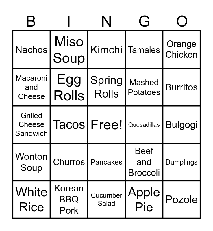This bingo card has a free space and 36 words: Fried Rice, Chow Mein, Dumplings, Egg Rolls, Beef and Broccoli, Wonton Soup, Spring Rolls, Steamed Rice, Orange Chicken, Vegetable Stir-fry, Tacos, Tamales, Enchiladas, Quesadillas, Burritos, Nachos, Empanadas, Churros, Pozole, Kimchi, Bulgogi, Dumplings, Korean BBQ Pork, White Rice, Cucumber Salad, Miso Soup, Grilled Cheese Sandwich, Chicken Noodle Soup, Mashed Potatoes, Macaroni and Cheese, Cheeseburger, Hot Dog, Apple Pie, Pancakes, Salad and Spaghetti with Meatballs.
