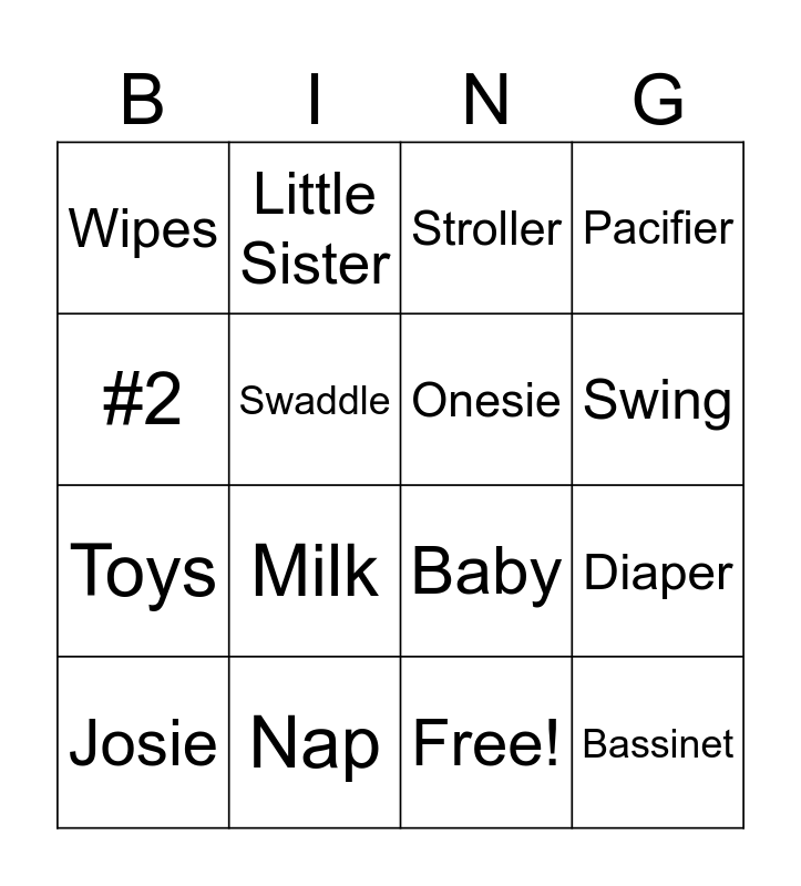 This bingo card has 17 words: Free!, Josie, Stroller, Wipes, Milk, Pacifier, Diaper, Onesie, Swing, Swaddle, Nap, Baby, #2, Little Sister, Toys, Crib and Bassinet.