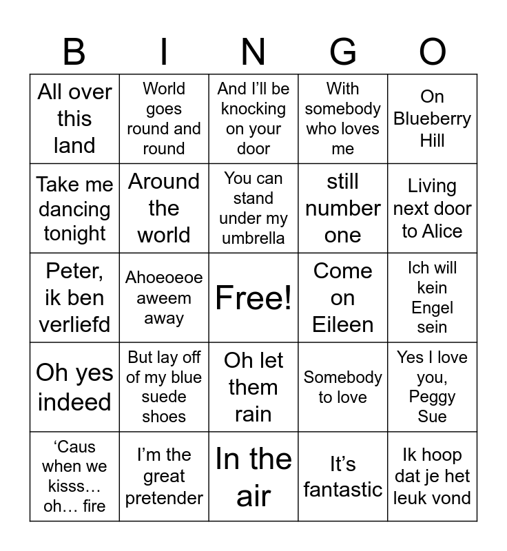 This bingo card has a free space and 29 words: ‘Caus when we kisss… oh… fire, A dream you woke up from, Ahoeoeoe aweem away, All about that bass, All over this land, And I’ll be knocking on your door, Around the world, But lay off of my blue suede shoes, Come on Eileen, I’m the great pretender, Ich will kein Engel sein, Ik hoop dat je het leuk vond, In the air, It’s fantastic, Living next door to Alice, Love is all you need, Oh let them rain, Oh yes indeed, On Blueberry Hill, Peter, ik ben verliefd, Somebody to love, Steal her away from me, still number one, Take me dancing tonight, With somebody who loves me, World goes round and round, Yes I love you, Peggy Sue, You can stand under my umbrella and You’re never alone.