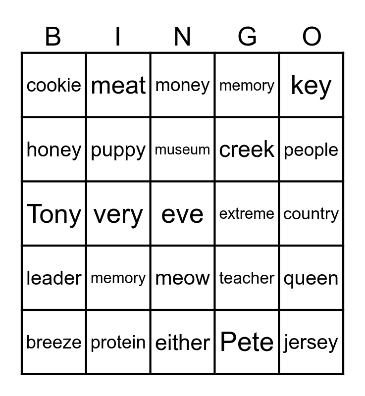 This bingo card has 51 words: Free!, eve, previous, either, memory, stream, meat, need, honey, donkey, puppy, memory, queen, teacher, leisure, receive, museum, extreme, nucleus, key, very, Pete, cookie, creek, belief, jersey, people, create, breeze, money, dream, crazy, thirty, ceiling, tea, protein, Chinese, rocky, cereal, complete, country, leader, read, calories, knee, relief, Tony, complete, please, meow and beat.