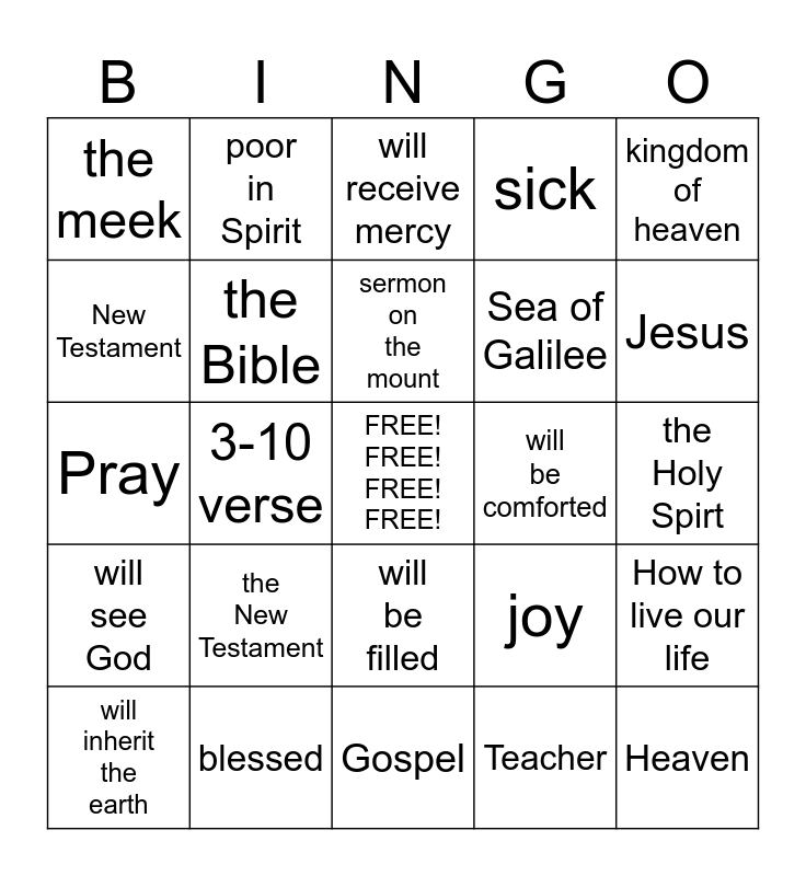 This bingo card has a free space and 34 words: hunger & thirst for righteous-ness, Teacher, those who mourn, peace makers, will see God, the Bible, kingdom of heaven, will inherit the earth, poor in Spirit, Matthew, sermon on the mount, will receive mercy, disciples, will be called children of God, will be comforted, Jesus, blessed, Pray, the New Testament, joy, will be filled, persecuted for righteous-ness, the meek, the Holy Spirt, Gospel, Heaven, sick, Beatitudes, Sea of Galilee, New Testament, Happiness, 3-10 verse, How to live our life and be satisfied.
