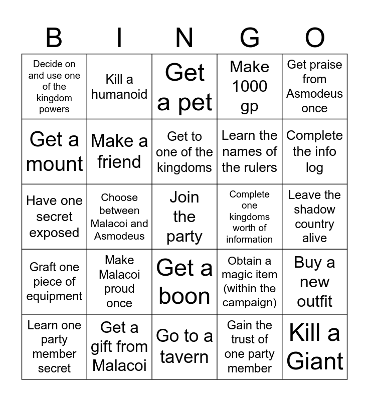 This bingo card has a free space and 24 words: Make Malacoi proud once, Get a gift from Malacoi, Get to one of the kingdoms, Learn one party member secret, Get praise from Asmodeus once, Decide on and use one of the kingdom powers, Get a mount, Kill a humanoid, Complete one kingdoms worth of information, Get a boon, Learn the names of the rulers, Have one secret exposed, Obtain a magic item (within the campaign), Buy a new outfit, Make a friend, Gain the trust of one party member, Leave the shadow country alive, Get a pet, Complete the info log, Choose between Malacoi and Asmodeus, Kill a Giant, Graft one piece of equipment, Make 1000 gp and Go to a tavern.