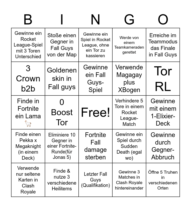 This bingo card has a free space and 24 words: Verwende nur seltene Karten in Clash Royale, Eliminiere 10 Gegner in einer Fortnite-Runde(für Jonas 5), Gewinne ein Fall Guys-Spiel, Gewinne 3 Matches in Clash Royale hintereinander, Erreiche im Teammodus das Finale in Fall Guys, Gewinne ein Rocket League-Spiel mit 3 Toren Unterschied, Stoße einen Gegner in Fall Guys von der Map, Gewinne ein Spiel in Rocket League, ohne ein Tor zu kassieren, Verhindere 5 Tore in einem Rocket League-Match, Gewinne mit einem 1-Elixier-Deck, Finde in Fortnite ein Lama 🦙, Goldenen skin in Fall guys, Gewinne ein Spiel durch Sudden Death (egal wo), Gewinne durch Gegner-Abbruch, 3 Crown b2b, Finde & nutze 3 verschiedene Heilitems, Letzter Fall Guys (Qualifikation), Werde von einem Teamkameraden gerettet, Tor RL, Finde einen Pekka x Megaknight (in einem Deck), 0 Boost Tor, Fortnite Fall damage sterben, Verwende Magagay plus XBogen and Öffne 5 Truhen in verschiedenen Orten.