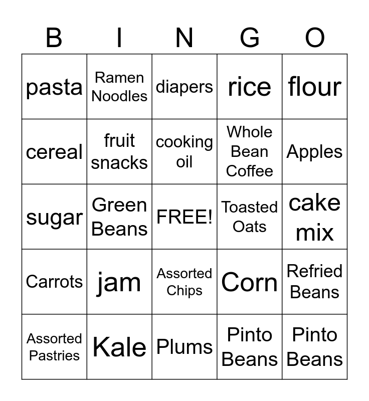 This bingo card has a free space and 80 words: canned vegetables, shampoo/ conditioner, diapers, oil, oatmeal, crackers, sugar, macaroni and cheese, canned beans, canned fish, canned meat, canned soup, rice, pasta, pasta sauce, cereal, peanut butter, jam, apple sauce, cake mix, dried fruit, flour, sugar, cooking oil, fruit snacks, Bananas, Chicken Thighs, Toilet Paper, Eggs, Whole Milk, Apples, Pears, Plums, Corn Tortillas, Assorted Pastries, Toasted Oats, Quick Rolled Oats, Lentils, Green Split Peas, Pinto Beans, Garbanzo Beans, White Rice, Tomato Soup, Chicken Noodle Soup, Broth, Ramen Noodles, Diced Chicken, Tuna, Garbanzo Beans, Black Beans, Refried Beans, Green Beans, Corn, Diced Tomatoes, Canned Peaches, Apple Sauce, Peanut Butter, Macaroni & Cheese, Penne, Assorted Chips, Whole Bean Coffee, Diapers, Toilet Paper, Bar Soap, Laundry Pods, Garbage Bags, Lava Cake, Potatoes, Onions, Garlic, Carrots, Kale, Butter, Flour, White Rice, Garbanzo Beans, Pinto Beans, Granola Bars, Ice Cream and Cheese.