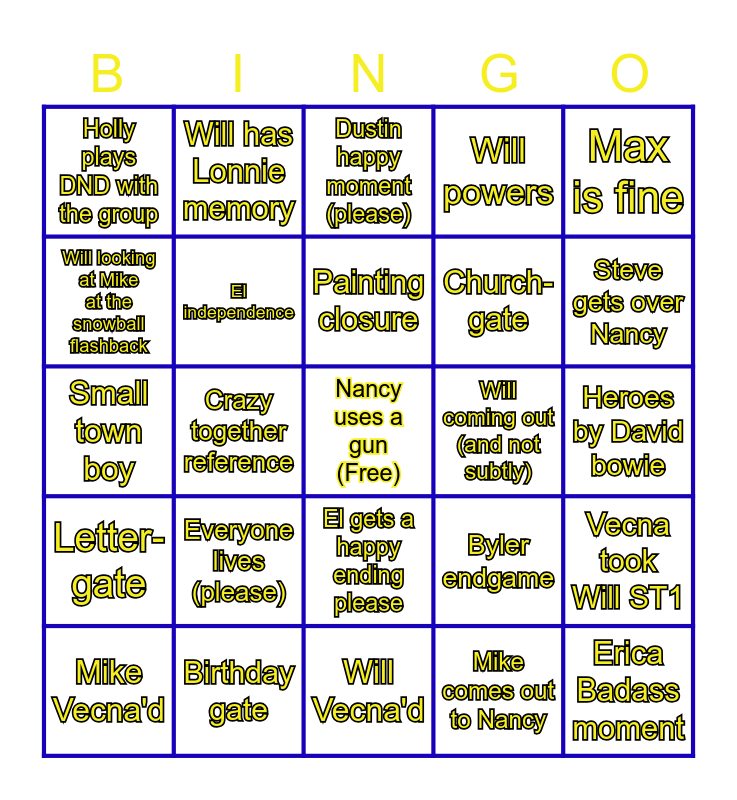 This bingo card has a free space and 36 words: Lovers-lake- gate, WLW MLM solidarity (Will and Robin), Ted says a homophobic one-liner again, El independence, Byler endgame, Letter-gate, Painting closure, Byler fighting, Max is fine, Jancy endgame, Crazy together reference, Will powers, El Dumps Mike, Will coming out (and not subtly), Steve gets over Nancy, Holly plays DND with the group, Karen accepting mother, Everyone lives (please), Erica Badass moment, Dustin happy moment (please), Heroes by David bowie, Vecna took Will ST1, Birthday gate, Mike Vecna'd, Will Vecna'd, Will has Lonnie memory, Small town boy, Mikes "Will voice", Church-gate, Will looking at Mike at the snowball flashback, Blue and Yellow, 7, Mike comes out to Nancy, El gets a happy ending please, Flicker-gate and Mr. Clarke comes in clutch.