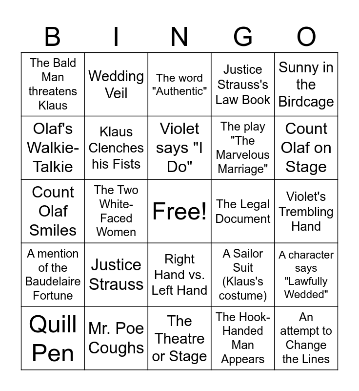 This bingo card has a free space and 24 words: Justice Strauss, Mr. Poe Coughs, Violet says "I Do", Quill Pen, Sunny in the Birdcage, The Bald Man threatens Klaus, Olaf's Walkie-Talkie, Wedding Veil, The Legal Document, Right Hand vs. Left Hand, The play "The Marvelous Marriage", Count Olaf Smiles, A Sailor Suit (Klaus's costume), A character says "Lawfully Wedded", Klaus Clenches his Fists, The Hook-Handed Man Appears, Violet's Trembling Hand, The word "Authentic", Count Olaf on Stage, The Two White-Faced Women, An attempt to Change the Lines, A mention of the Baudelaire Fortune, Justice Strauss's Law Book and The Theatre or Stage.