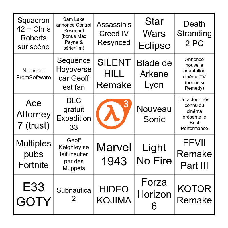 This bingo card has a free space and 24 words: E33 GOTY, Geoff Keighley se fait insulter par des Muppets, SILENT HILL Remake, Forza Horizon 6, Death Stranding 2 PC, Squadron 42 + Chris Roberts sur scène, Sam Lake annonce Control Resonant (bonus Max Payne & série/film), Assassin's Creed IV Resynced, Nouveau Sonic, Un acteur très connu du cinéma présente le Best Performance, Ace Attorney 7 (trust), Séquence Hoyoverse car Geoff est fan, Light No Fire, FFVII Remake Part III, Nouveau FromSoftware, Subnautica 2, HIDEO KOJIMA, Star Wars Eclipse, Annonce nouvelle adaptation cinéma/TV (bonus si Remedy), Multiples pubs Fortnite, DLC gratuit Expedition 33, Marvel 1943, Blade de Arkane Lyon and KOTOR Remake.