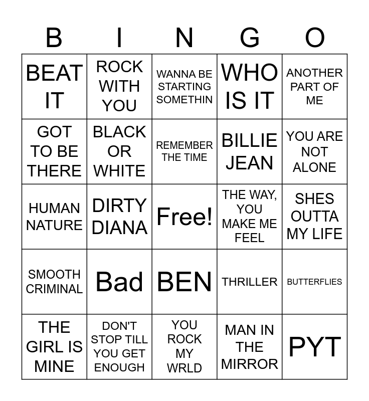 This bingo card has a free space and 24 words: Bad, DON'T STOP TILL YOU GET ENOUGH, REMEMBER THE TIME, THE GIRL IS MINE, ANOTHER PART OF ME, BEAT IT, GOT TO BE THERE, ROCK WITH YOU, THE WAY, YOU MAKE ME FEEL, BEN, BILLIE JEAN, HUMAN NATURE, THRILLER, BUTTERFLIES, BLACK OR WHITE, MAN IN THE MIRROR, SHES OUTTA MY LIFE, WANNA BE STARTING SOMETHIN, YOU ARE NOT ALONE, DIRTY DIANA, PYT, SMOOTH CRIMINAL, WHO IS IT and YOU ROCK MY WRLD.