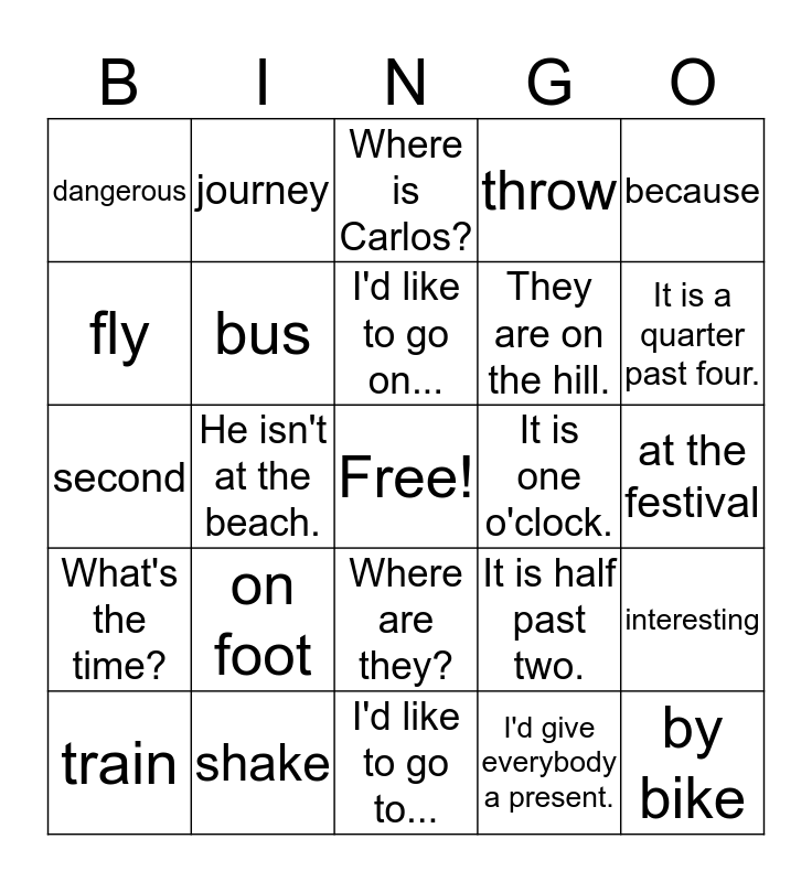 This bingo card has a free space and 70 words: in the air, at the festival, kick off, get up, shake, jump, throw, dream, because, important, interesting, cute, dangerous, Where is Carlos?, He is at school., He isn't at the beach., Where are they?, They are on the hill., They aren't in the backyard., What's the time?, It is one o'clock., It is half past two., It is a quarter past four., It is a quarter to five., I am listening to music., He is kicking off his shoes., They are jumping up and down., I'd give it all to you., I'd give everybody a present., travel the world, journey, America, Australia, England, France, Germany, Netherlands, Sweden, walk, fly, drive, on foot, by bike, by car, public transport, bus, train, fast, slow, I can't sing this song., I can't play the piano.\, I can swim., I can make breakfast., Where would you like to go?, I'd like to go to..., When would you like to go?, I'd like to go on..., How would you like to go?, I'd like to fly/drive/walk., first, second, third, fourth, fifth, sixth, seventh, eighth, ninth, tenth and It's on the second of February..
