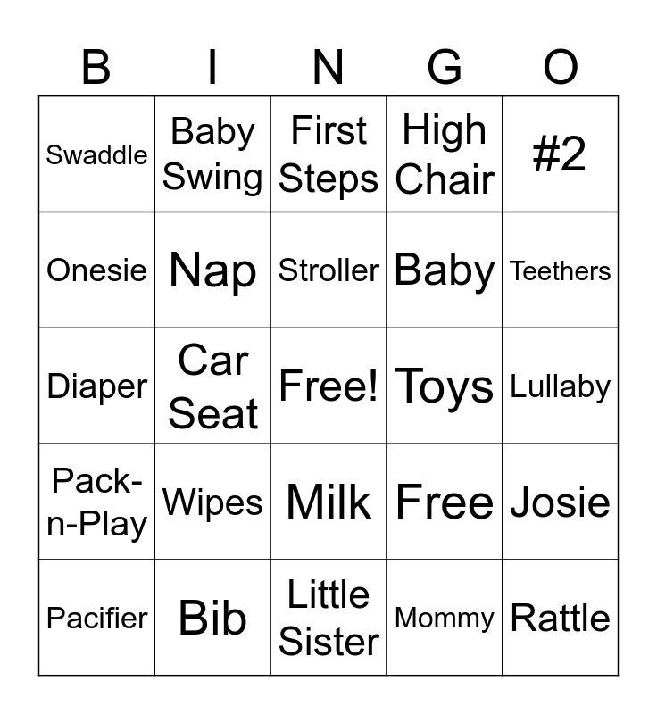 This bingo card has a free space and 25 words: Wipes, Little Sister, Stroller, Pacifier, #2, Swaddle, Onesie, Baby Swing, Toys, Milk, Baby, Diaper, Free, Josie, Nap, Bassinet, Lullaby, First Steps, Teethers, Car Seat, Rattle, Bib, Pack-n-Play, High Chair and Mommy.