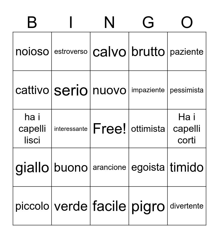 This bingo card has a free space and 49 words: felice, divertente, altruista, facile, buono, bello, estroverso, difficile, cattivo, triste, serio, brutto, timido, egoista, sportivo, generoso, nuovo, ottimista, grande, paziente, interessante, pigro, noioso, impaziente, tirchio, pessimista, piccolo, vecchio, arancione, giallo, rosso, grigio, marrone, bianco, verde, nero, ha i capelli biondi, ho i capelli castani, Ha i capelli corti, ha i capelli lunghi, ho gli occhi nocciola, ha gli occhi azzurri, ha gli occhi marroni, ha i capelli ricci, ha i capelli lisci, calvo, carino, giovane and anziano.