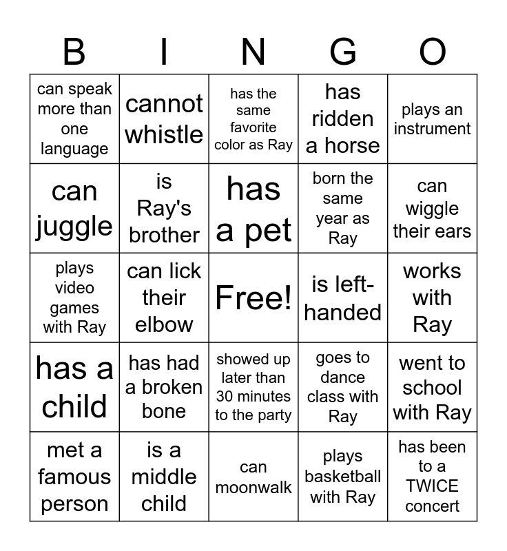 This bingo card has a free space and 24 words: has had a broken bone, is a middle child, has a pet, met a famous person, plays an instrument, can speak more than one language, can juggle, cannot whistle, is left-handed, showed up later than 30 minutes to the party, born the same year as Ray, plays video games with Ray, goes to dance class with Ray, went to school with Ray, is Ray's brother, plays basketball with Ray, works with Ray, has the same favorite color as Ray, can wiggle their ears, can lick their elbow, has been to a TWICE concert, has a child, has ridden a horse and can moonwalk.