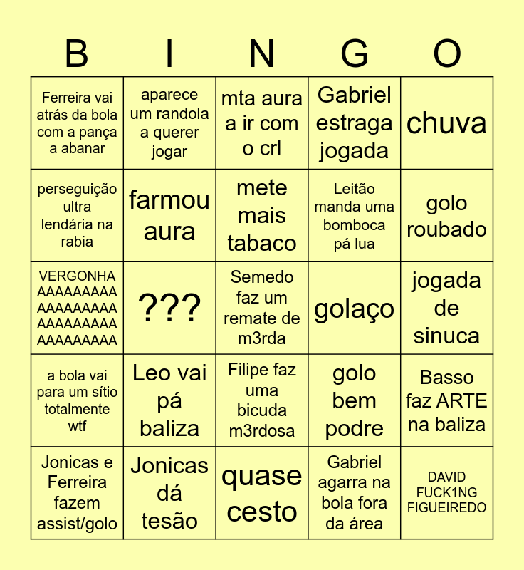 This bingo card has a free space and 36 words: Basso perde no "nn sou", Filipe leva ganda cueca, um simples golo, Leitão manda uma bomboca pá lua, DAVID FUCK1NG FIGUEIREDO, Jonicas e Ferreira fazem assist/golo, Leo vai pá baliza, Gabriel queima, Gabriel estraga jogada, discussão insana, a bola vai para um sítio totalmente wtf, ???, frangão, jogada de sinuca, VERGONHA AAAAAAAAA AAAAAAAAA AAAAAAAAA AAAAAAAAA, aparece um randola a querer jogar, quase cesto, golaço, golo roubado, Ferreira vai atrás da bola com a pança a abanar, Jonicas dá tesão, mete mais tabaco, golo bem podre, cabeçada de m3rda, Basso termina a semana sem golos, farmou aura, mta aura a ir com o crl, hat trick, chuva, perseguição ultra lendária na rabia, O IMPOSSÍVEL ACONTECEU, Filipe faz uma bicuda m3rdosa, Gabriel agarra na bola fora da área, Basso faz ARTE na baliza, a categoria do Figo and gordo da merda.