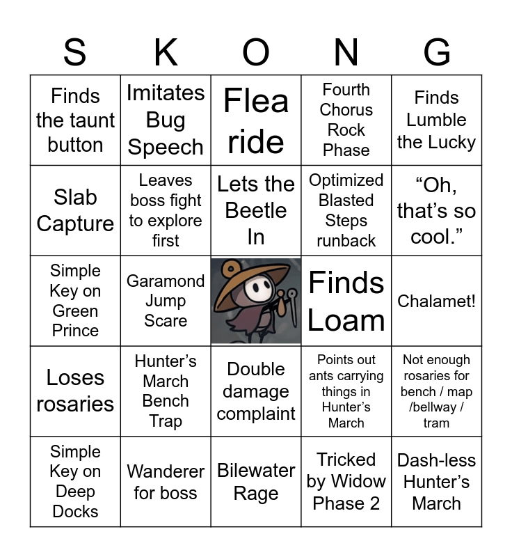 This bingo card has a free space and 50 words: “How big IS this game?”, Dash-less Hunter’s March, >5 Deaths to Savage Beastfly, Bilewater Rage, Hunter’s March Bench Trap, Mists Route to Act 2, Imitates Bug Speech, “AWOOO!”, Slab Capture, “I don’t think I’m supposed to be here.”, Leaves boss fight to explore first, Fourth Chorus Rock Phase, Not enough rosaries for bench / map /bellway / tram, Points out ants carrying things in Hunter’s March, Stops and vibes to music, Cogwork Dancer Depression, Lets the Beetle In, Finds Loam, Finds Loddie, Finds Lumble the Lucky, Garamond Jump Scare, Tricked by Widow Phase 2, Finds the taunt button, Optimized Blasted Steps runback, Sniped to death by conefly, “What, what is THIS?”, “Oh, that’s so cool.”, Spends rosaries and misses out, Flea ride, Double damage complaint, No boss rewards complaint, “POSHANKA!”, Hunter pogo discourse, Reaper for boss, Wanderer for boss, Beast for boss, >5 Deaths to Last Judge, Moorwing jump scare, Sinner’s Road rage, Chalamet!, Never uses Needle Strike, Dies to Last Judge explosion, >5 Deaths to Skarr Guardian, Simple Key on Wormways, Simple Key on Deep Docks, Simple Key on Green Prince, Asks chat for help, Hornet slap, Loses rosaries and Understands the Mist in <10 minutes.