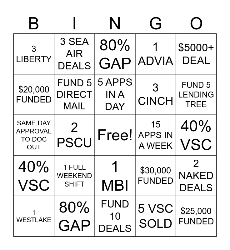 This bingo card has a free space and 24 words: 1 WESTLAKE, 1 FULL WEEKEND SHIFT, 5 APPS IN A DAY, 5 VSC SOLD, $5000+ DEAL, 3 LIBERTY, 3 SEA AIR DEALS, 80% GAP, 15 APPS IN A WEEK, 40% VSC, SAME DAY APPROVAL TO DOC OUT, FUND 5 DIRECT MAIL, $30,000 FUNDED, 2 NAKED DEALS, $20,000 FUNDED, 80% GAP, FUND 10 DEALS, 1 ADVIA, FUND 5 LENDING TREE, 40% VSC, 2 PSCU, 1 MBI, 3 CINCH and $25,000 FUNDED.