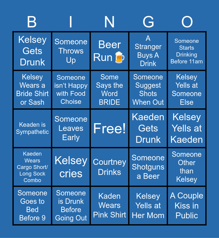 This bingo card has a free space and 24 words: Kelsey cries, Someone is Drunk Before Going Out, Some Says the Word BRIDE, Someone Goes to Bed Before 9, Someone Starts Drinking Before 11am, Kelsey Gets Drunk, Kelsey Wears a Bride Shirt or Sash, Someone Throws Up, Kaeden Gets Drunk, Courtney Drinks, Someone Suggest Shots When Out, Keaden is Sympathetic, Someone Shotguns a Beer, Someone Other than Kelsey, Someone isn’t Happy with Food Choise, Kelsey Yells at Her Mom, Kelsey Yells at Kaeden, Beer Run🍺, Kelsey Yells at Someone Else, Someone Leaves Early, A Couple Kiss in Public, Kaeden Wears Cargo Short/ Long Sock Combo, A Stranger Buys A Drink and Kaden Wears Pink Shirt.