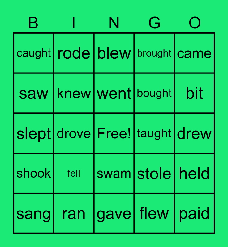 This bingo card has a free space and 24 words: fell, ran, went, sang, came, caught, saw, rode, taught, swam, bought, slept, stole, held, knew, flew, drew, blew, bit, drove, paid, shook, brought and gave.