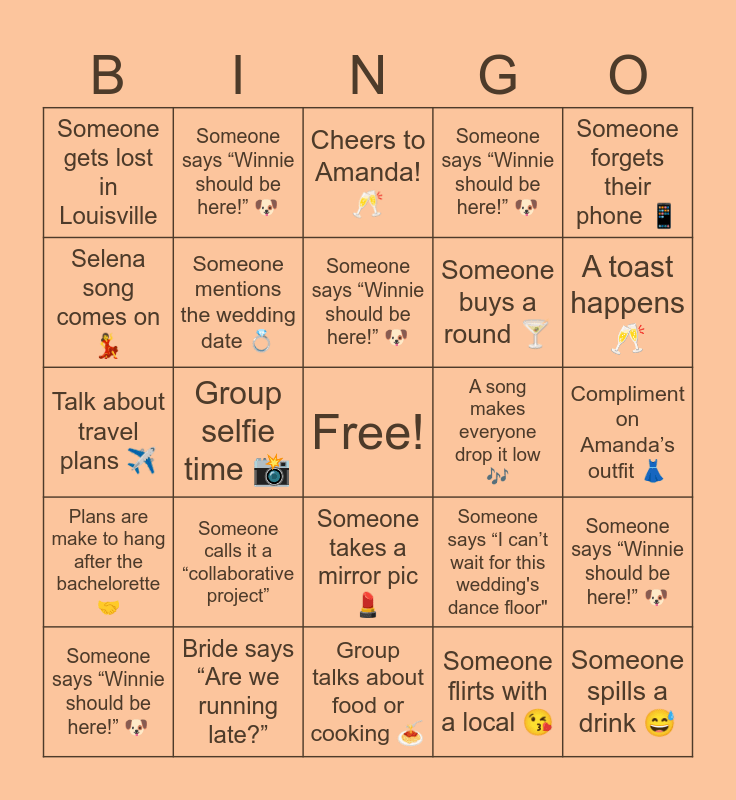 This bingo card has a free space and 29 words: Someone says “Winnie should be here!” 🐶, Champagne is popped 🍾, Group selfie time 📸, Jeneva takes charge 📝, Someone gets lost in Louisville, Cheers to Amanda! 🥂, Someone mentions the wedding date 💍, Someone calls it a “collaborative project”, A song makes everyone drop it low 🎶, Bride says “Are we running late?”, Compliment on Amanda’s outfit 👗, Someone spills a drink 😅, Group talks about food or cooking 🍝, Someone flirts with a local 😘, A toast happens 🥂, Bride talks about her fiancé 💕, Someone takes a mirror pic 💄, Plans are make to hang after the bachelorette 🤝, Someone forgets their phone 📱, Talk about travel plans ✈️, Someone says “I can’t wait for this wedding's dance floor", Bride gives educational advice 🗂️, Someone buys a round 🍸, Selena song comes on 💃, Someone says “Winnie should be here!” 🐶, Someone says “Winnie should be here!” 🐶, Someone says “Winnie should be here!” 🐶, Someone says “Winnie should be here!” 🐶 and Someone says “Winnie should be here!” 🐶.