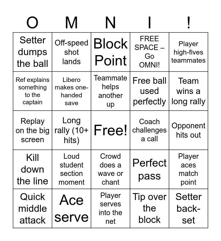 This bingo card has a free space and 30 words: Ace serve, Time-out called, Long rally (10+ hits), Player dives for a dig, Setter dumps the ball, Block Point, Libero makes one-handed save, Crowd does a wave or chant, Coach challenges a call, Player serves into the net, Opponent hits out, Setter back-set, Tip over the block, Pancake save, Team wins a long rally, Player gets subbed in, Perfect pass, Kill down the line, Loud student section moment, Player high-fives teammates, Replay on the big screen, Big block celebration, Off-speed shot lands, Free ball used perfectly, Ref explains something to the captain, FREE SPACE – Go OMNI!, Player aces match point, Quick middle attack, Teammate helps another up and Big cheer after timeout.